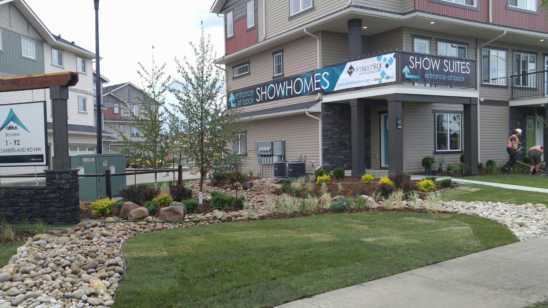 Sisbro Landscaping Inc has several package prices available for builders wanting to budget the price of landscaping into the sale of every home. We can coordinate landscaping to be done just before move in date so the work is complete and clean for your homebuyer. We offer full packages with rough grade to certification included so you can concentrate on your customers needs-not trying to coordinate the disaster surrounding their front door. Nothing is better than moving into your new home only having to buy but a lawnmower. We have completed several large condominium projects in the Edmonton region in the last few years including Infusion for Rohit in Ambleside and the Brownstones in Terwillegar for Grande Design group. Whatever your landscaping needs, however large or small, the work will be done on time and with the attention to detail that has set us apart for 12 years running.